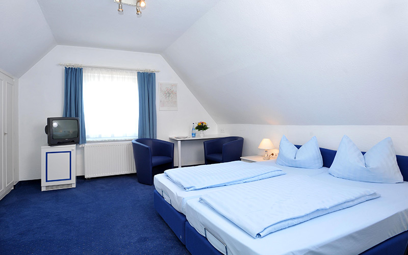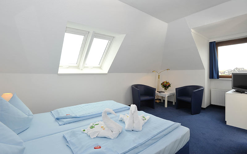 Das Strandhotel verfügt über insgesamt 26 Zimmer, diese verteilen sich über das Erdgeschoss, die erste und die zweite Etage, sowie in allen vier Himmelsrichtungen. Freundlich, hell, in friesischem blau-weiß gehalten, werden Sie beim Betreten Ihres Zimmers empfangen und können Ihren Urlaub in vollen Zügen genießen.